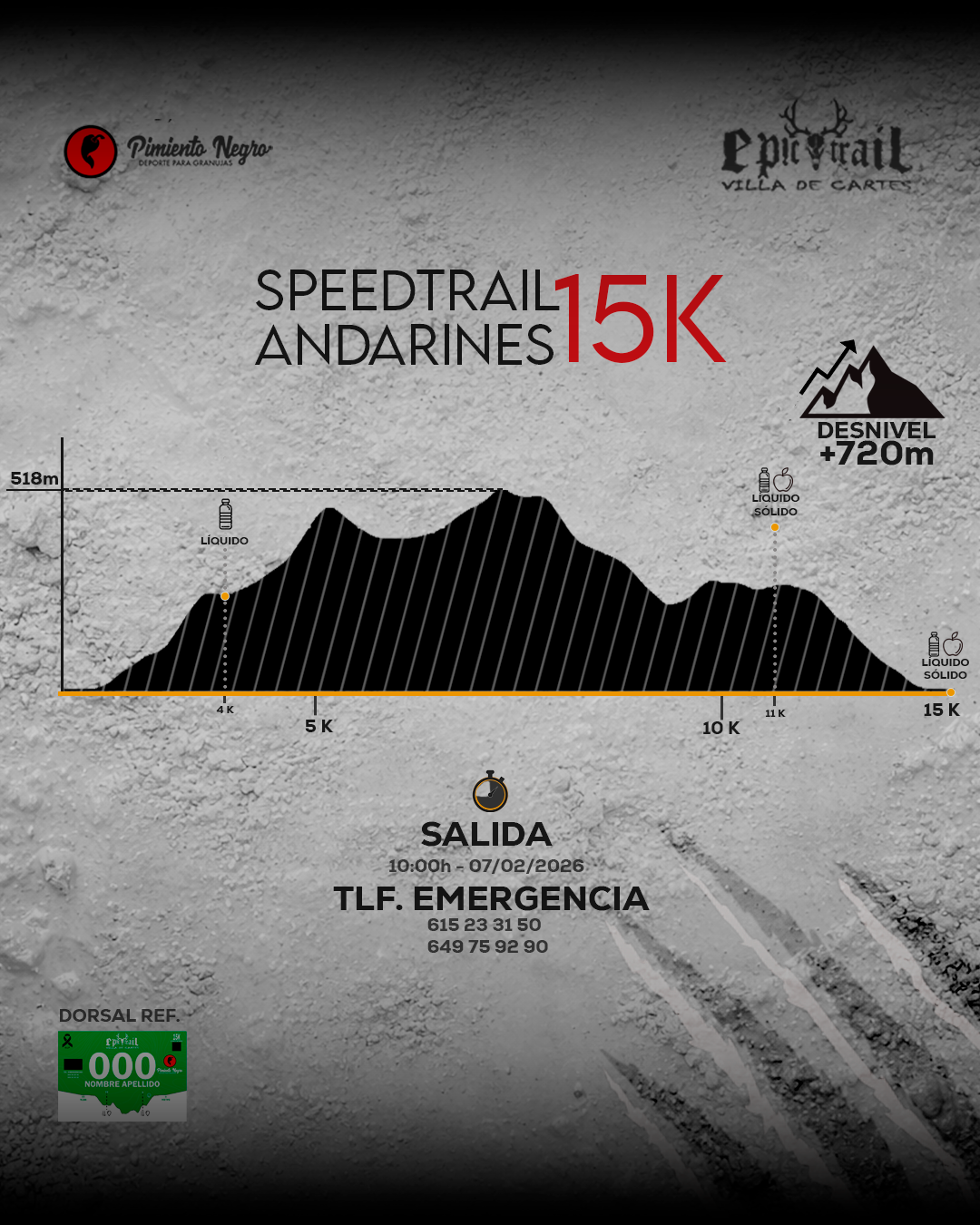 Epic Andarines, esta prueba de 15km y 720m de desnivel positivo, comparte recorrido con el Epic Speed Trail. El recorrido discurre por todo tipo de terrenos siendo un completo lujo para los sentidos. Una modalidad no competitiva para todos aquellos que solamente quieran disfrutar del deporte, la naturaleza y el ambiente único del Epic Trail Villa de Cartes.